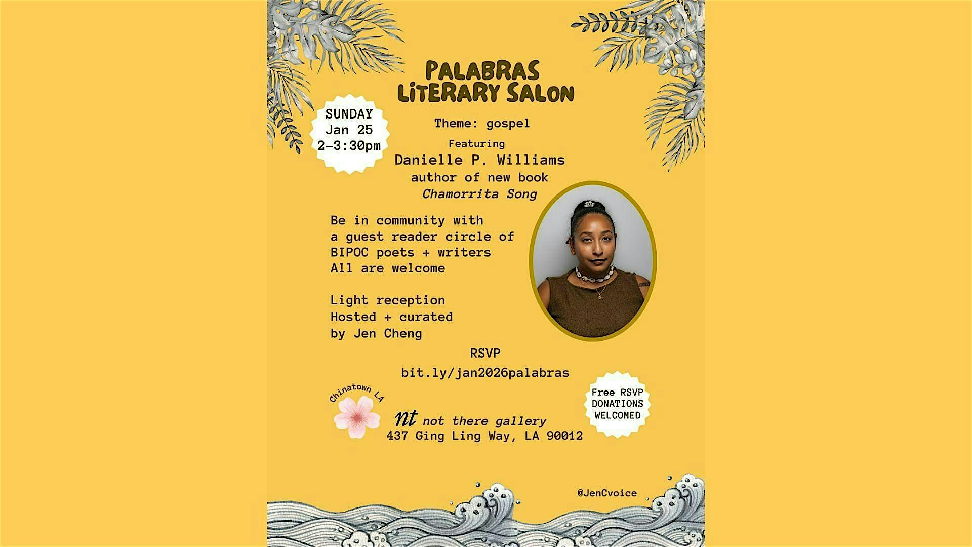 Our January edition features Danielle P. Williams to celebrate her new poetry book from Arizona Press, CHAMORRITA SONG, and other writing. Our event has a guest readers circle, a curated invited list of diverse BIPOC poets, writers, playwrights, and creators to read 3-minutes of writing to celebrate this salon’s theme of “gospel.” All are welcome to attend – especially bring your allies and others curious to hear BIPOC voices.